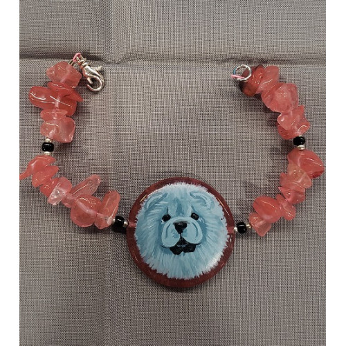 This is a blue chow chow on a cherry quartz bracelet. non sterling silver & size is 7.5 " long,