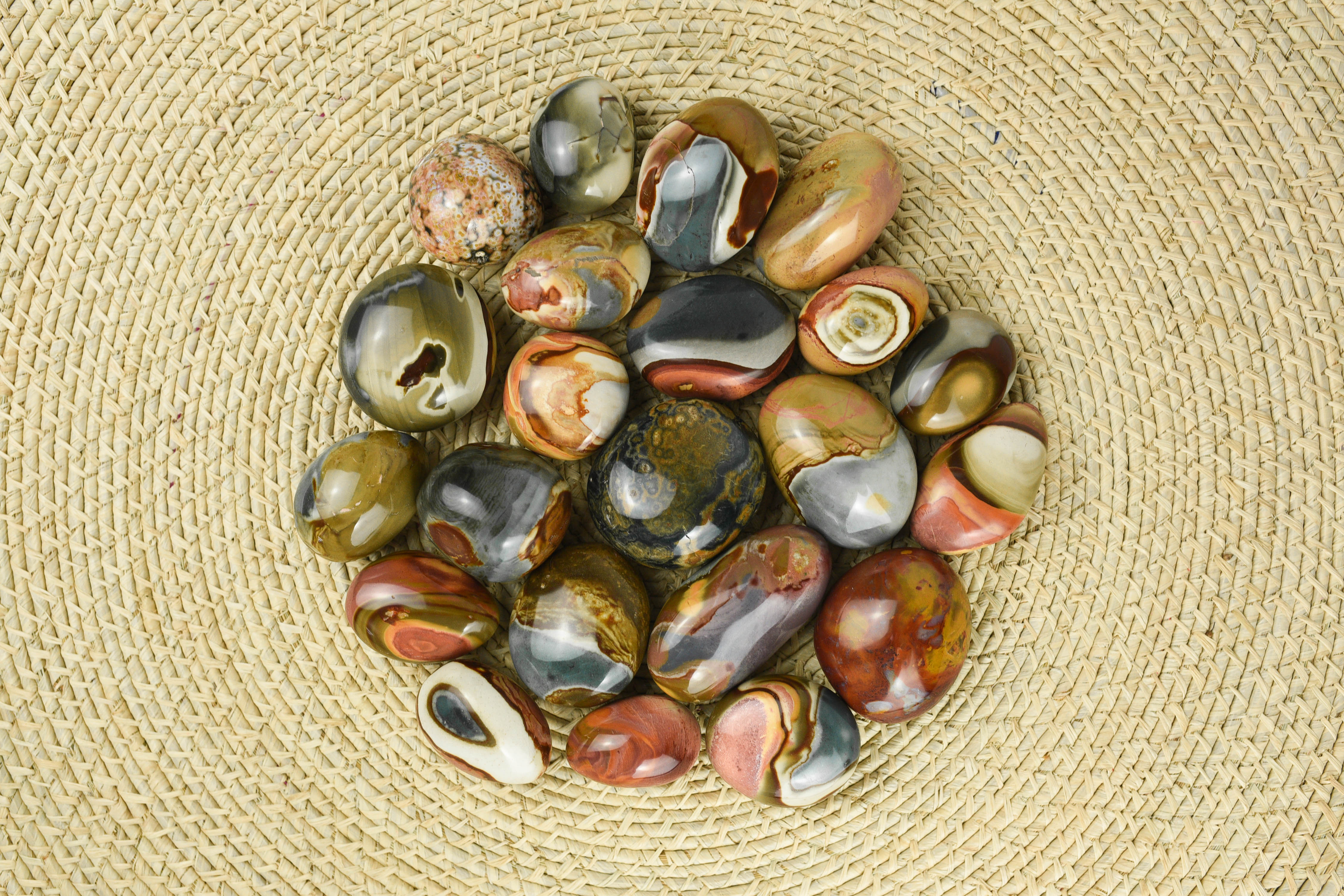 Jasper, an aggregate of microgranular quartz and/or chalcedony and other mineral phases, is an opaque, impure variety of silica, usually red, yellow, brown or green in color; and rarely blue. The common red color is due to iron(III) inclusions